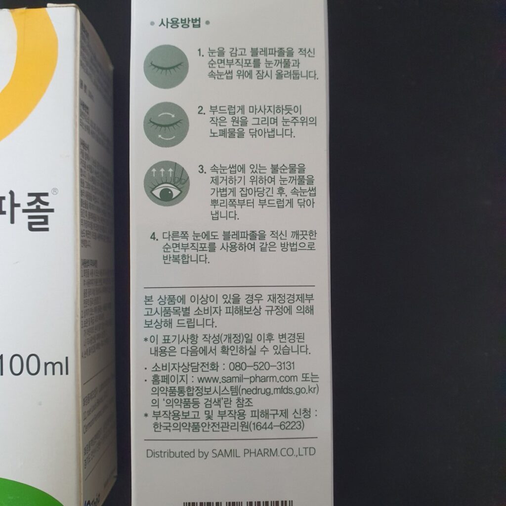 지금은 눈병이 다 나았고, 두번째 산 제품이 많이 남아있는데, 간간히 눈이 답답하거나 눈곱을 떼고 싶을 때 몇 방울씩 세정포에 떨어뜨려 사용한다. 용법에 눈꺼풀 세정이 필요할 때마다 사용한다고 써있으니, 용법과 다르게 사용하는 것은 아니다.